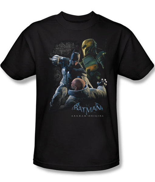 Get the shirt that shows what Batman does best in these Arkham video games: punch the tuna salad out of the bad guys. This image is from Arkham Origins, showing Batman in mid-swing and with Deathstroke on the shirt.