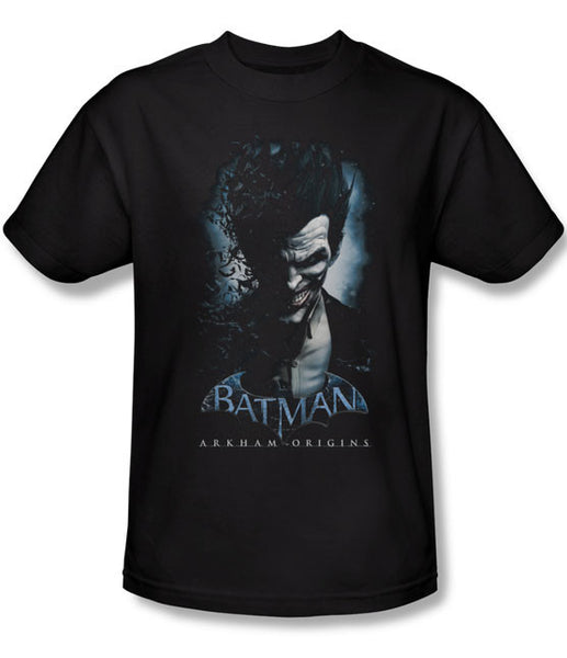It's just not as much fun without The Joker involved in these Arkham video games. Even though he's not voiced by Mark Hamill in Batman Arkham Origins, we're pretty sure he puts on a good performance. Notice in this mens t-shirt the bats that make up half of his image. Hmm.