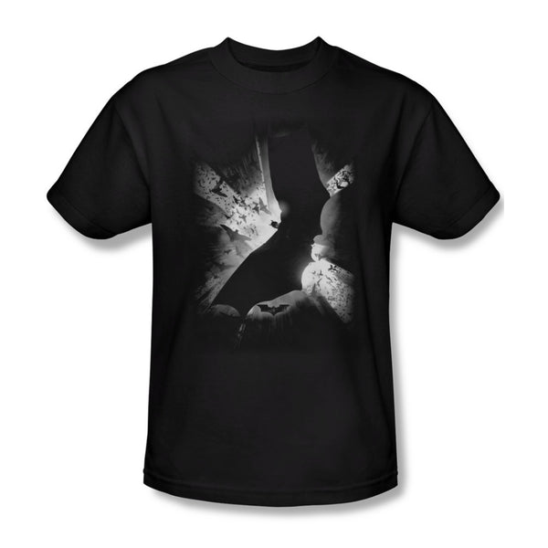 Batman swoops down in The Narrows during Batman Begins, the first movie of The Dark Knight Trilogy. Own this movie poster design on a mens t-shirt. Available in black.