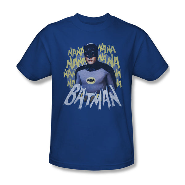 The ending lyrics to the classic Batman 1966 TV series is shown behind Adam West as Batman on this awesome Royal Blue mens t-shirt that is available in sizes Small to 3XL.