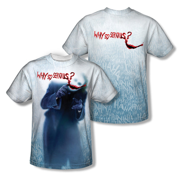 Awesome Joker mens t-shirt from The Dark Knight movie with his menacing rhetorical question Why So Serious? that you can have both on the front and back of this all-over-print sublimation t-shirt.