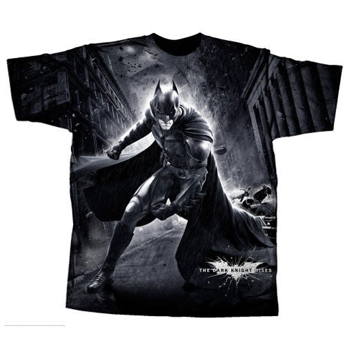 Batman is ready for his epic battle from the Dark Knight Rises movie on this shirt. It's an all-over-print design on the front and shows Batman poised to kick Bane's butt.