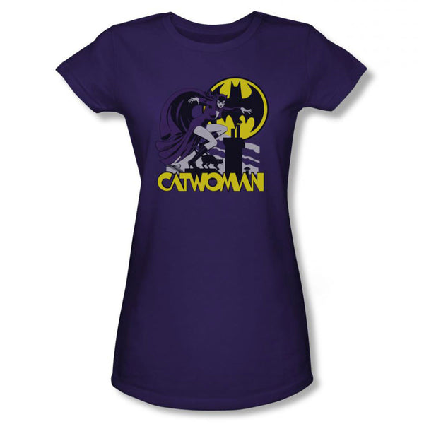 Looks like Catwoman is trapped on a rooftop or is expecting Batman to drop by any moment judging by the look on her face in this vintage-looking purple t-shirt with the Batsignal behind her. Available in junior sizes from Small to XL
