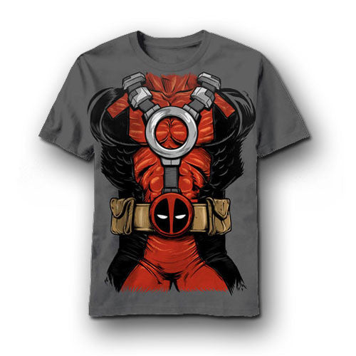 Have fun dressing like your favorite mercenary by putting on this Deadpool Costume T-shirt (available in Mens' sizes). No need to wear red spandex or carry weapons when you wear this. Well, maybe a sword.