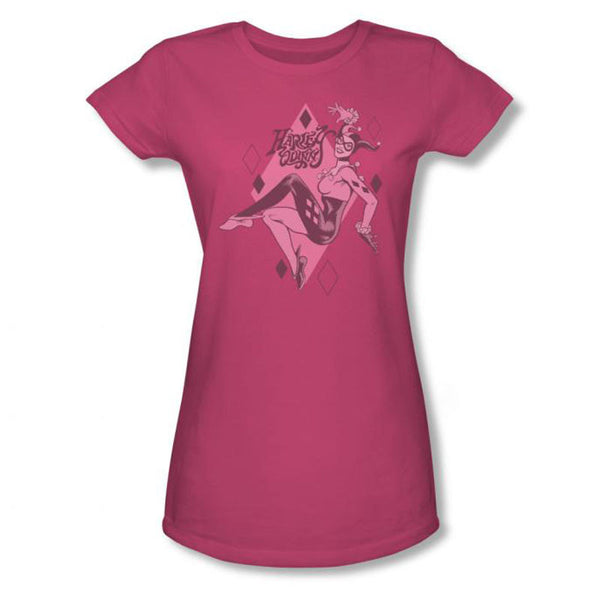 You've seen this wacky, confused gal fall in love with Mr. J on Batman: The Animated Series. Now's your chance to show off your Harley Pride with this Juniors shirt in pink. This shirt is also available in Womens sizes.