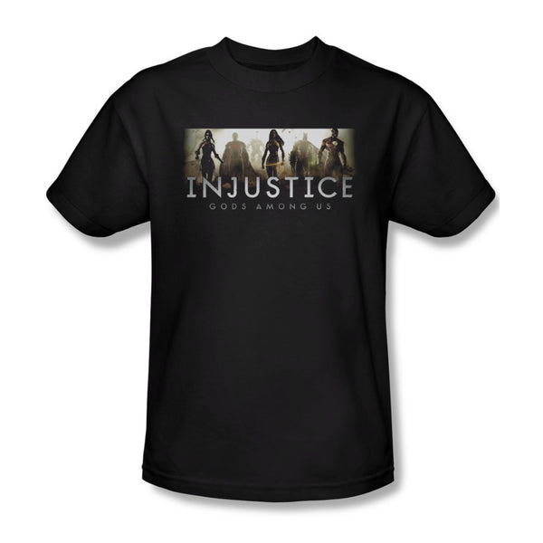 This is an awesome t-shirt from an awesome video game. Get the logo of Injustice: Gods Among Us design on a t-shirt. It features the likes of Harley Quinn, Superman, Wonder Woman, Batman and The Flash. Available in mens sizes.