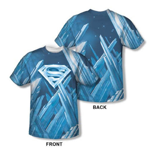 Superman fans will gasp when they see you wear this freakin' phenomenal t-shirt that shows a frosty shield and Superman's Fortress Of Solitude on both sides of the shirt thanks to a new printing process called dye sublimation. You can get this shirt with only the front design. Whether 2-sided or front side only, we give you a choice of either 100% Polyester or 65/35 Poly/Cotton blend. Makes a great gift for any Superman fan who wear a mens-sized t-shirt.
