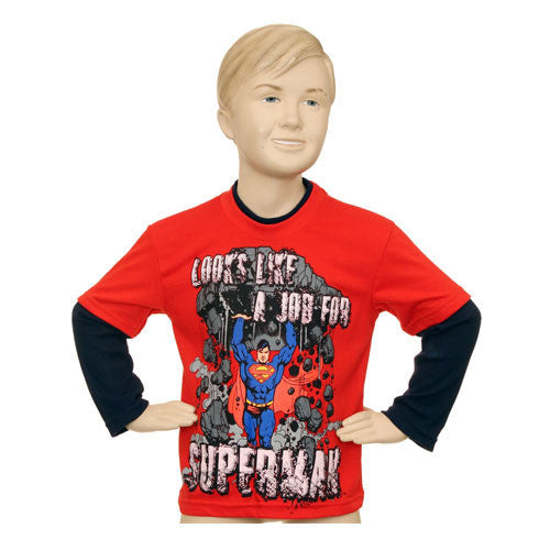 Graphic shirt reads, "Looks Like A Job For ... Superman"