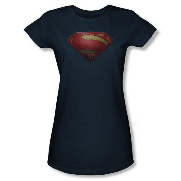 If you're a fan of Superman and the Man Of Steel movie, you'll love this Superman Man Of Steel Shield form-fitting Juniors t-shirt in navy blue, showing the new Superman design that represents hope.