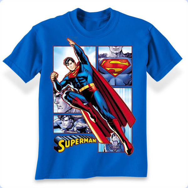 When looking for a Superman shirt to buy for a young Man Of Steel fan, you can't go wrong with this Panels shirt design: it's got five different images of Superman from just his face to him head to toe flying up. And his name in the classic lettering design in yellow and blue. This shirt will definitely put a smile on the face on the face of the person you're buying this for. Isn't this what buying superhero products is all about?