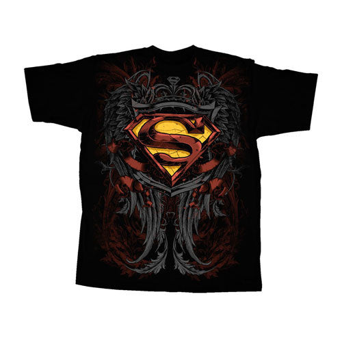 Superman fans will dig this design of a crest we call the Son of Krypton. It has a unique design that has subtle undertones of blue and burgundy. The S symbol is not as bright as the classic logo and fits nicely smack in the middle of the shirt. What we like about the shirt is the cracks of age in the yellow and how the red in the shirt gets richer as you get closer to the symbol. This t-shirt is definitely a keeper for Superman fans and makes a great present for Christmas or birthdays.