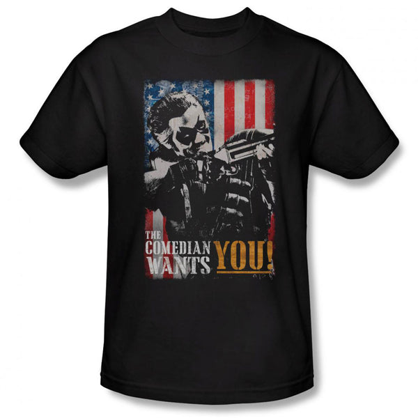 Enjoy this propaganda-like shirt of The Comedian holding a gun in front of the American flag. Image of The Comedian is from the Watchmen movie.