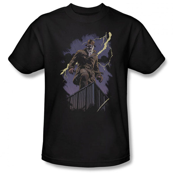 The night belongs to Rorschach. Even if it's raining with thunder and lightning as shown in this Watchmen mens' t-shirt.