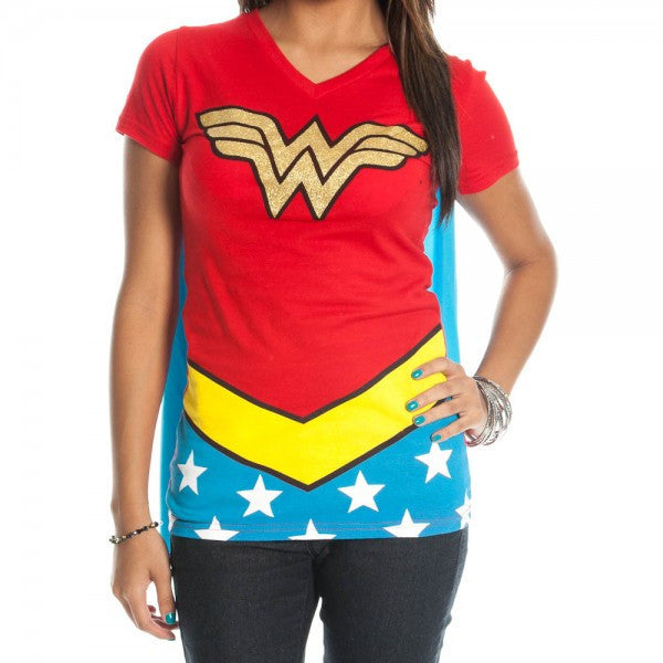 Wonder Woman Costume Juniors V-Neck T-Shirt With Cape