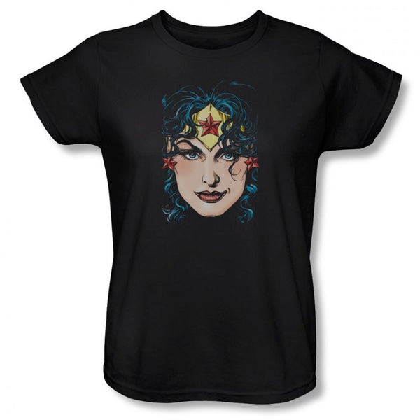 This is a great close-up image of Wonder Woman's head, highlighting her tiara and black hair. Available in Womens sizes.
