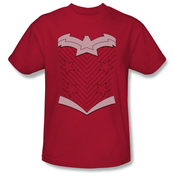 If you enjoy the new 52 costume design of Wonder Woman from the re-booted comic book series, you will definitely enjoy this costume t-shirt. It's in red and available in mens sizes.